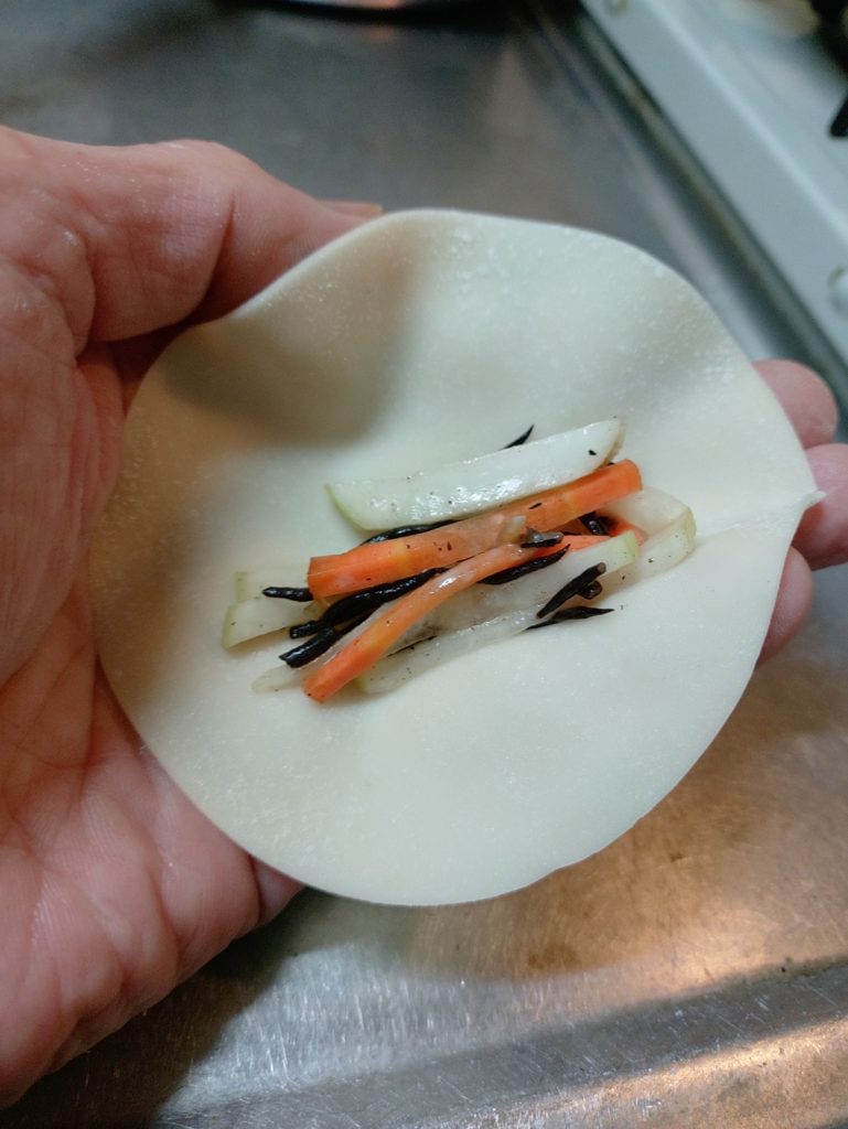 ネギみそ、なますを巻いてフライパンで焼きます。